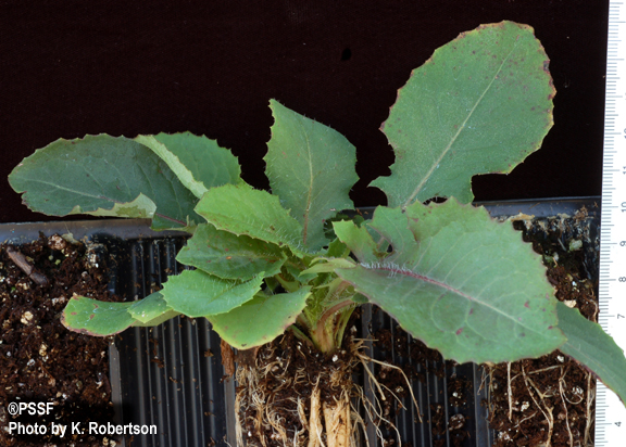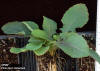 Leaves: Simple, spoon-shaped, winged petiole, serrated margins, hairs, purplish midvein