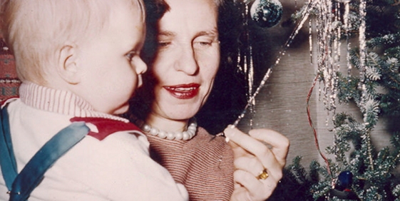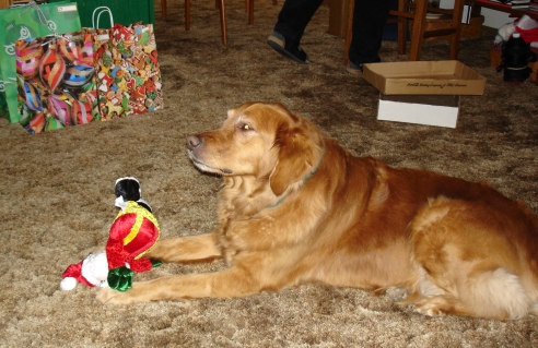 the dog celebrates with a Christmas doll. —Donna Binns |