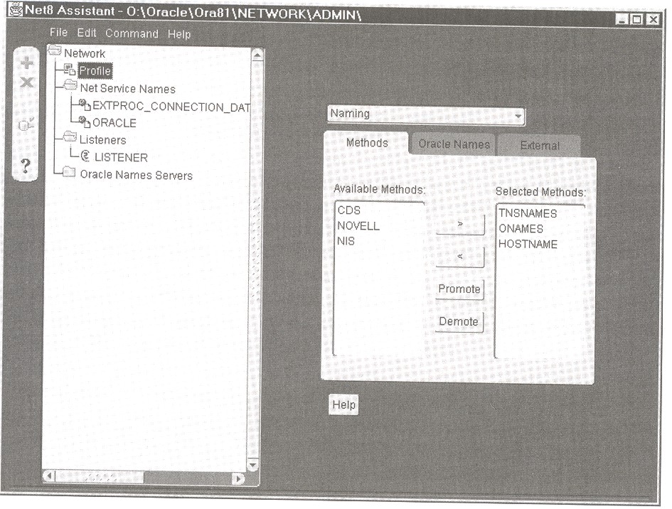 To display the properties of the current profile, click the Profile icon in the network tree of Net8 Assistant. Figure 3-13 shows the Naming properties of the current profile, specifically the methods that Net8 uses to resolve connection requests to network services.