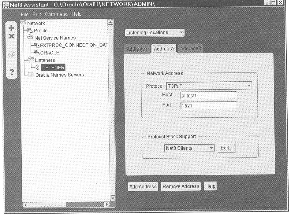 Figure 3-14 shows the properties of an address of the default listener named LISTENER that was automatically configured by the installer. In this example, notice that the address is specifically for Net8 Clients that want to establish TCP/IP connections.