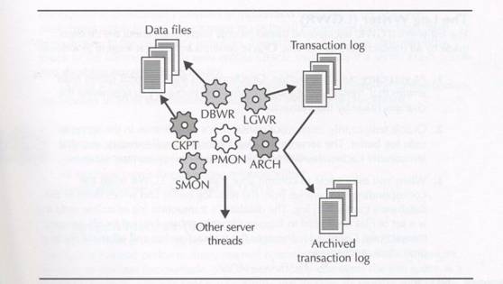 H Oracle uses a number of background server threads (for example, DBWR, LGWR, ARCH, CKPT, SMON, and PMON) to perform specialized internal functions.