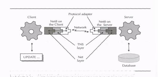 The Net8 software that executes on both clients and servers in an Oracle network includes several different layers of functionality that work to hide the complexities of network communication in a distributed processing application. On the client side, Net8 permits an application to locate and access a remote database using SQL as if the database resided on the same computer. On the server side, Net8 permits the database server to receive and send data in response to client SQL requests as though the client were running on the same machine as the server.